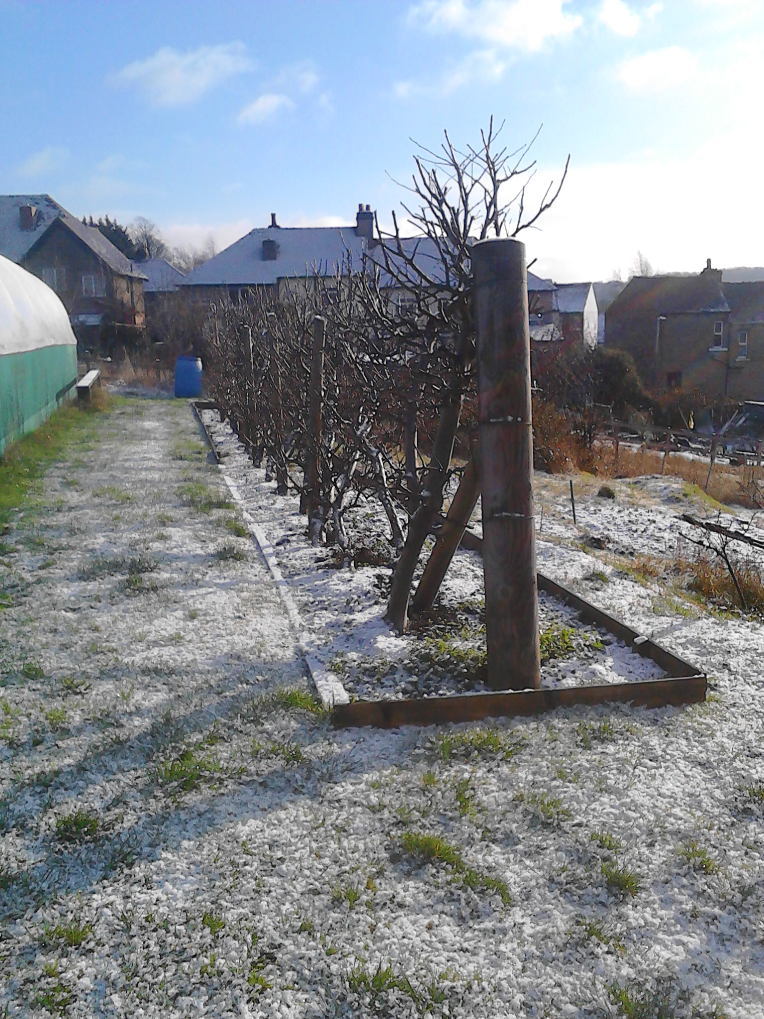 Previous Image Next Image Dewhurst_2019 snow melting around the large cordons by the polytunnel planted to screen the polytunnel when built IMG_20190130_105003